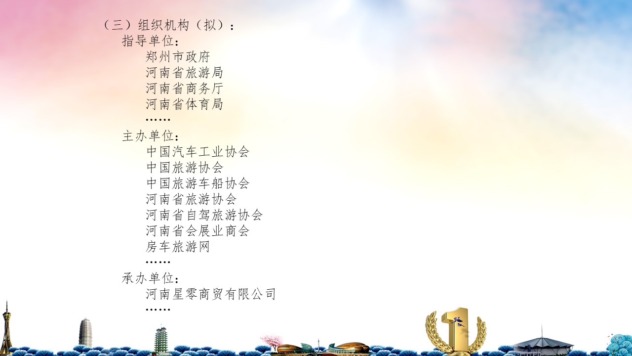 (三)组织机构(拟): 指导单位: 郑州市政府 河南省旅游局 河南省商务厅 河南省体育局 …… 主办单位: 中国汽车工业协会