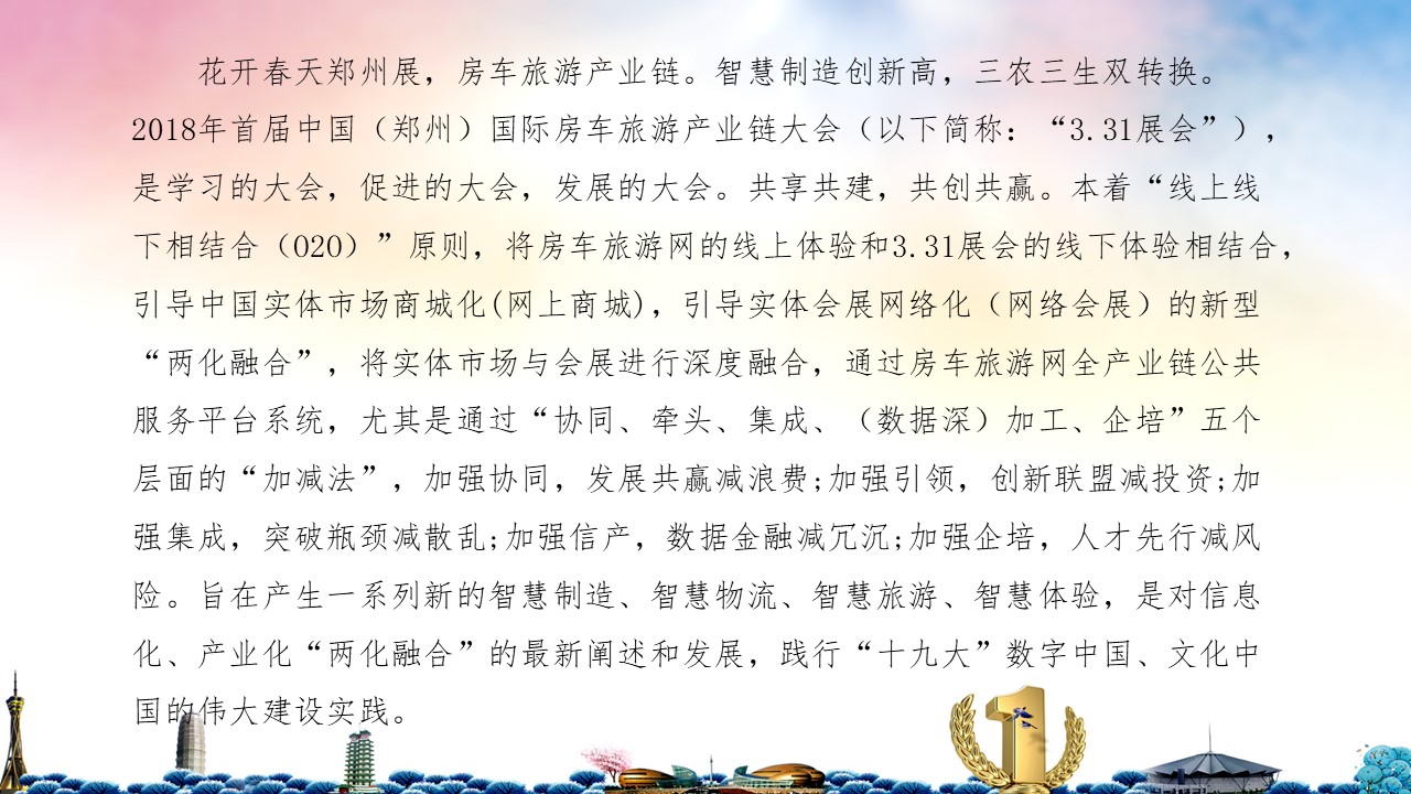花开春天郑州展,房车旅游产业链。智慧制造创新高,三农三生双转换。2018年首届中国(郑州)国际房车旅游产业链大会(以下简称:“3.31展会”),是学习的大会,促进的大会,发展的大会。共享共建,共创共赢。本着“线上线下相结合(O2O)”原则,将房车旅游网的线上体验和3.31展会的线下体验相结合,引导中国实体市场商城化(网上商城),引导实体会展网络化(网络会展)的新型“两化融合”,将实体市场与会展进行深度融合,通过房车旅游网全产业链
