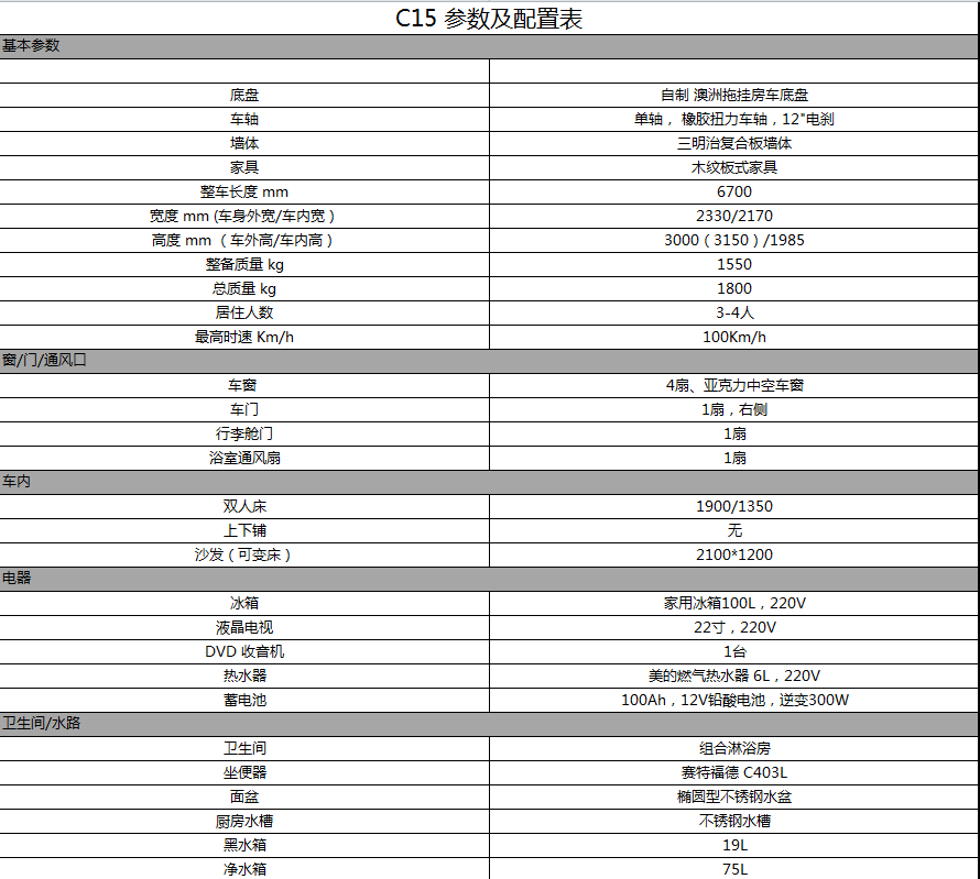 戴德隆翠C15拖挂式上路房车  16.8万元 配置表1