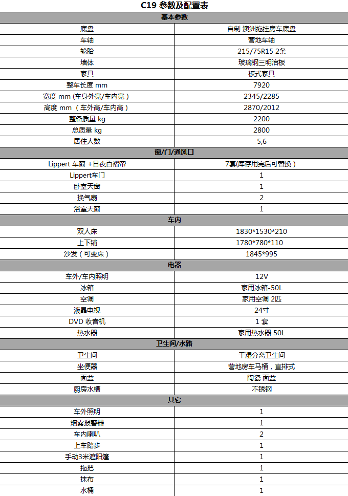 戴德隆翠C19拖挂式营地房车 17万元 配置表1