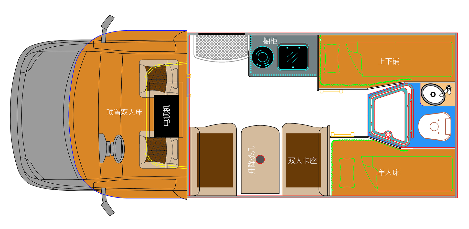 新星房车通途系列C600-租赁定制版(四人床)43.8万元 租赁定制改良版-双侧三铺布局图
