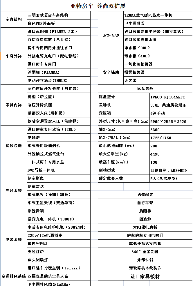 亚特房车 芳语之韵尊尚双扩展国产依维柯手动挡房车 62.8万元 配置表