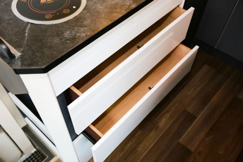 厨房区域虽小,但却五脏俱全,车辆配备了一台900W电磁炉,一款房车专用85L冰箱也可为您随时提供新鲜的食材。