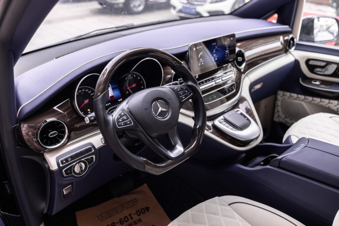 奔驰威霆梵影版 车辆采用奔驰最新研发2.0T高功率发动机,配备7速自动变速箱,给车辆带来极其平顺驾驶感受。前舱点介绍:多功能方向盘、换挡拨片、定速巡航、12.1寸导航屏。中控台采用真皮包覆式设计质感更强。