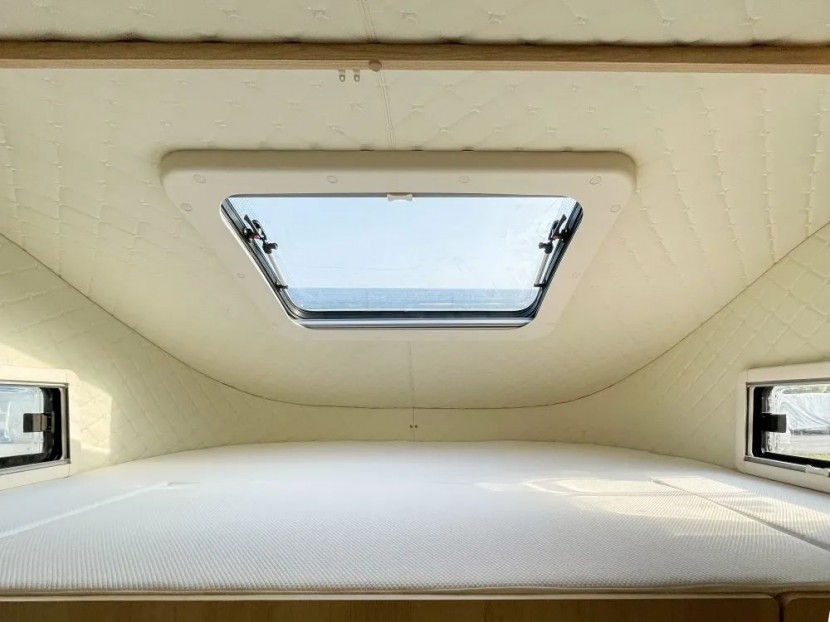 驾驶舱上方为一张2220×1580mm的双人床,可以容纳两名成年人在此休息,顶部设有天窗,采光效果极佳,此外还可以通过天窗进行通风换气,以保证室内空气清新。结束了一天疲劳的驾驶,待夕阳西下,夜幕降临,携爱人一同躺在床上透过天窗看星河,将心事讲给晚风,讲给流星,讲给群星闪烁的夜空,然后换一夜安稳的梦。