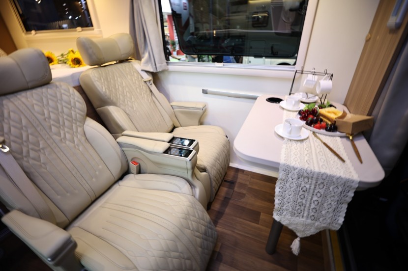 进入到驾驶室的部分,车内选用了浅蓝色的内饰搭配卡其色的软包座椅,整体的风格清新又明亮。车内配备了多功能方向盘,并且安装了电动加热加宽的外后视镜、LSWS车道偏离警示系统、定速巡航、倒车雷达和倒车影像等帮助车内的驾驶员更好的安全驾驶。车内安装了原车中控屏,支持车机手机互联和GPS导航,驾驶员可以通过手机对车辆的驾驶进行导航,另外车内还安装了TPMS主动胎压预警系统留媒体,可以保证汽车的驾驶处在安全的范围内。主副驾驶还安装了安全气囊,副驾驶的座位可以旋转180°与会客厅的人员进行交流。