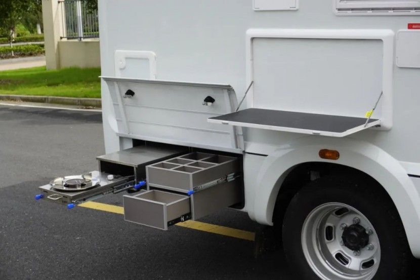 户外厨房区域升级了高原补偿型的柴油灶,在柴油灶的旁边设计了户外桌板和多个储物的收纳格,可以放置调料或者油瓶,保证在车辆行驶的过程中不受损坏。